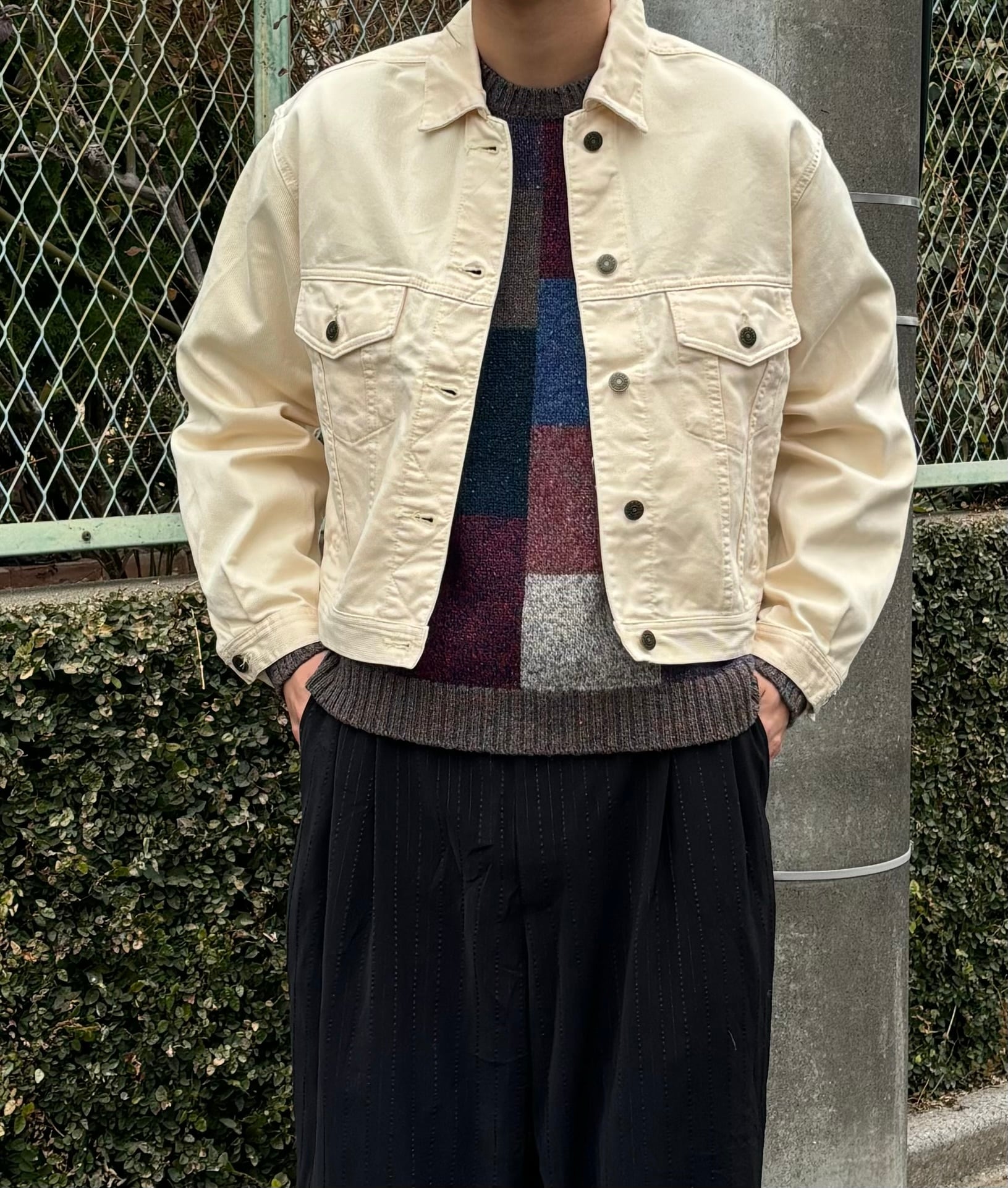 ニット、開襟シャツとかの上から春は着たいですね